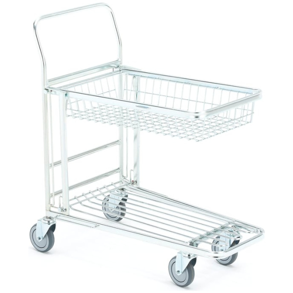 Cadrul căruciorului este fabricat din oțel galvanizat și este echipat cu un raft și un coș. Raftul superior sau coșul poate fi pliat în jos pentru a facilita mutarea sau depozitarea căruciorului atunci când nu este utilizat. Cu partea superioară pliată în jos, puteți transporta mai ușor și articole mai mari.