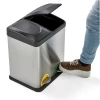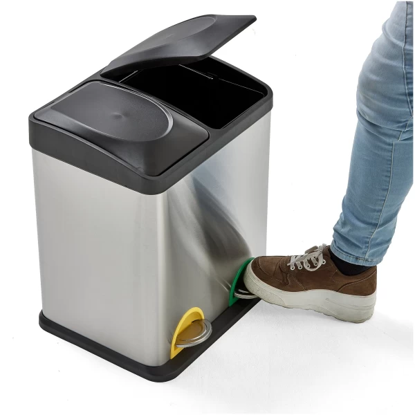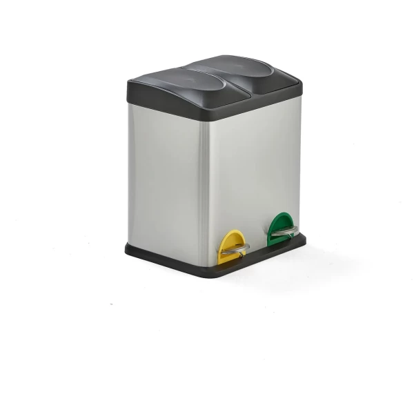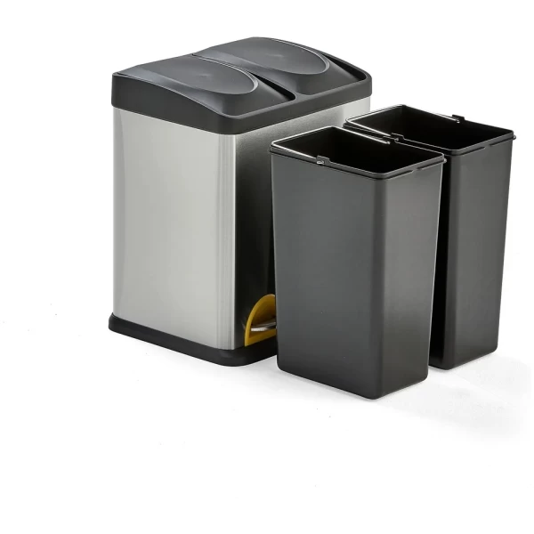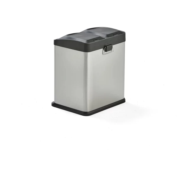 Coș de gunoi modern, realizat din oțel inoxidabil, ideal pentru separarea deșeurilor.